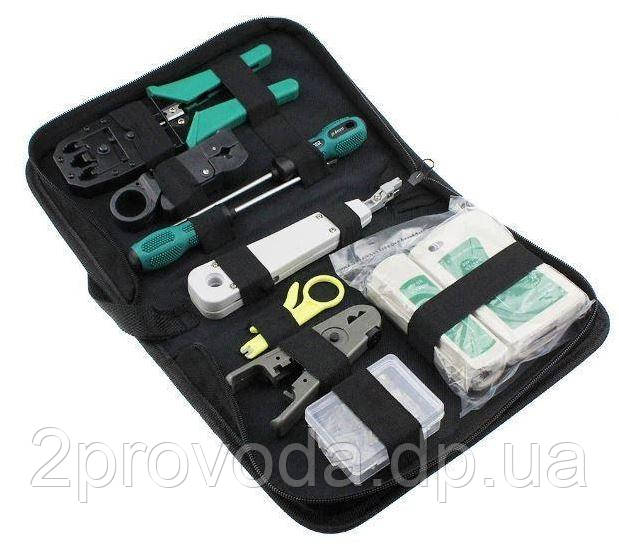 Набір мережива містить найнеобхідніші інструменти: обтискний інструмент, тестер, ніж для зачищення кабелю, стрипер, інструмент для закладення кабелю, конектор стандарту rj45, викрутки.